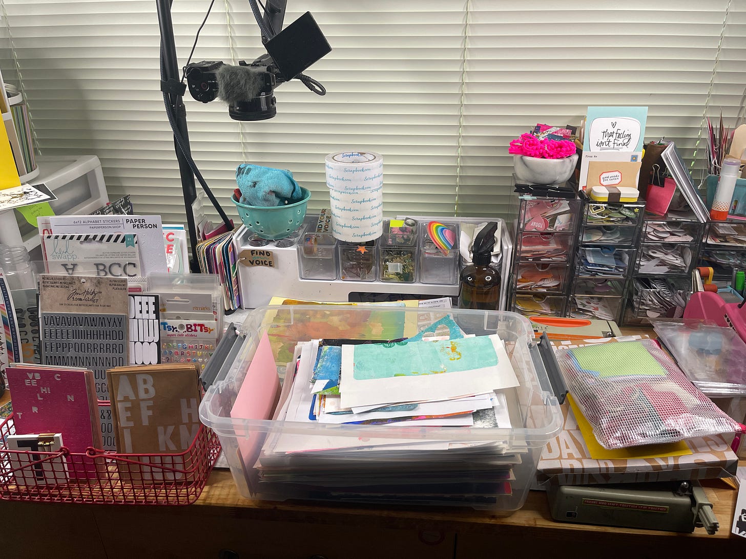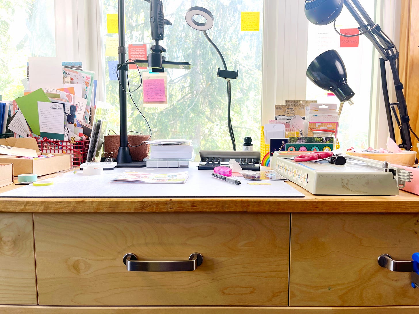 I can walk into my studio, come to my desk, grab what I want, and make a page—without worrying I’m going to knock over six different precarious piles.