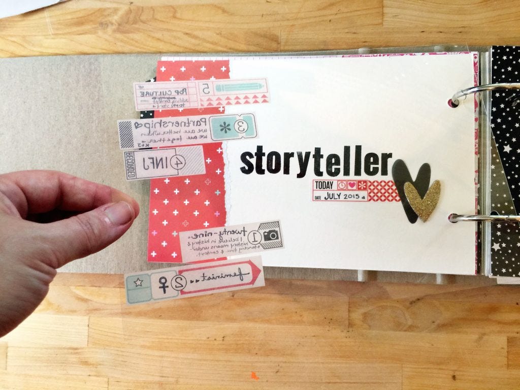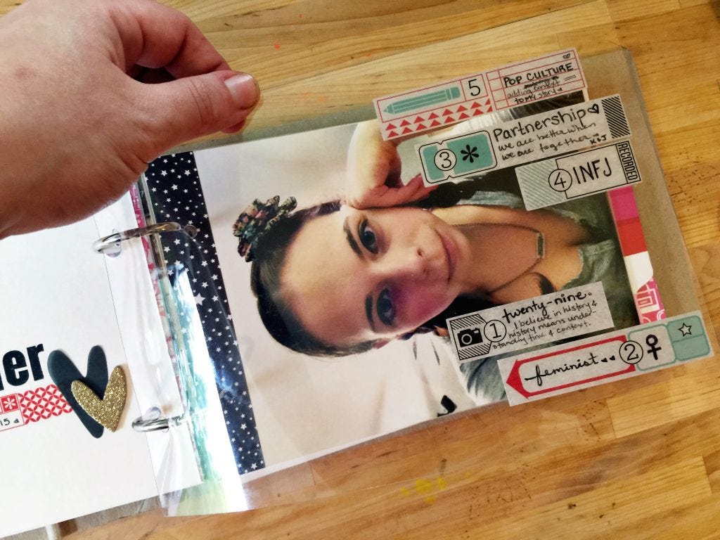 For this spread I to focus on a couple of key important parts of who I am as the storyteller. I used a clear acrylic page to create an overlay that laid right on top of my oversized photo.