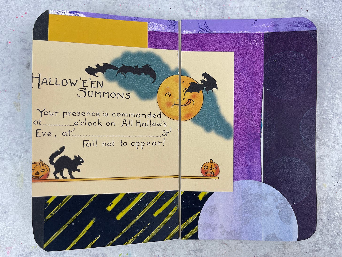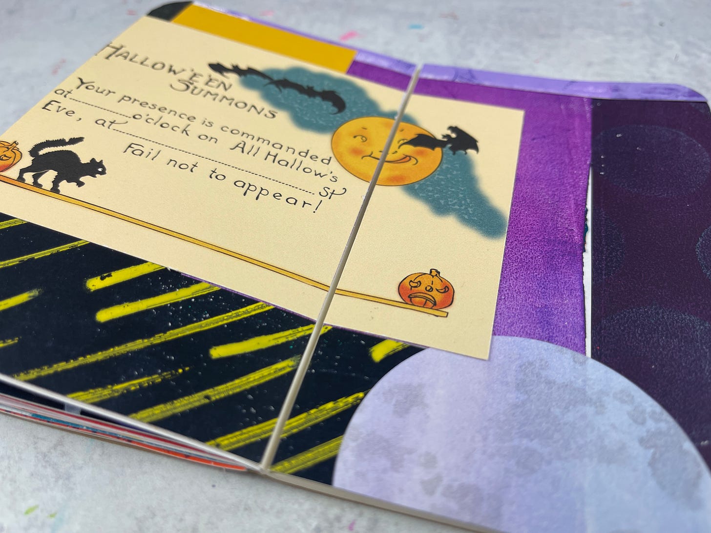 Today, I decided that we’d pull different purples and other dark colors so we can continue on with the Halloween theme in my current notebook. After creating my dark colored collage page, I trimmed it down to fit in the notebook and then added this fun little vintage postcard from old-school scrapbook company October Afternoon. I’ve got a few more of these cute postcards, so you’ll see a few other ones in the next few weeks.