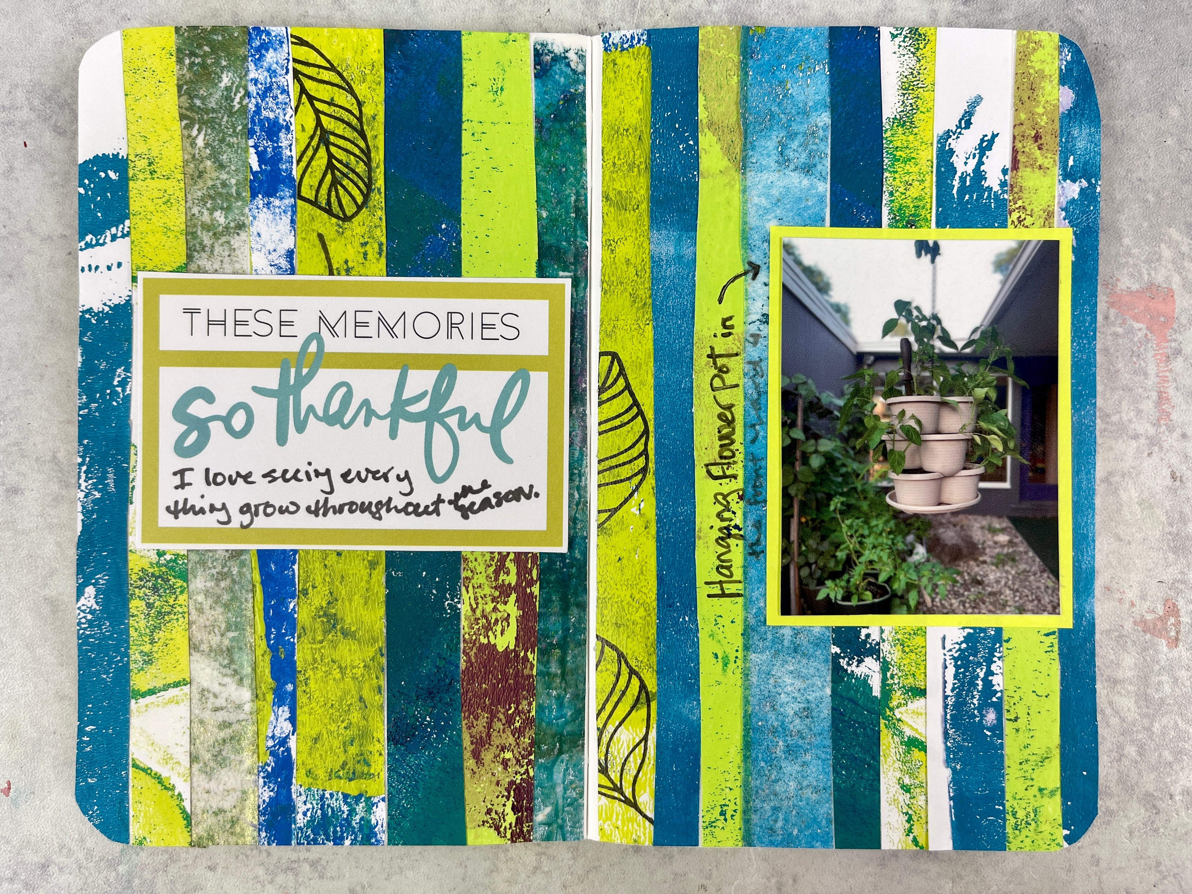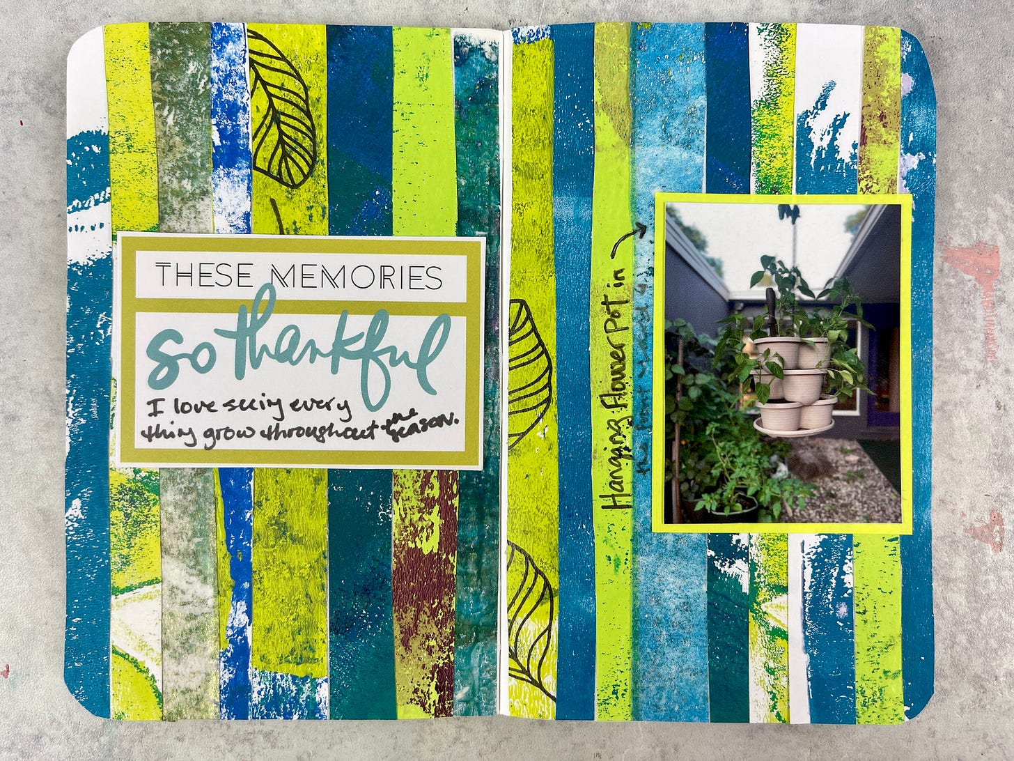 One of my favorites came from leftover scraps. My Field Notes notebooks are a little narrower than letter-size paper, so I always end up with 1.5-inch strips. Gel prints, patterned scraps, stamped backgrounds—they pile up. One day I laid a bunch of strips across a spread, then added a photo and a sticker on top. Done. It was simple, it was scrappy, and it made me ridiculously happy.
