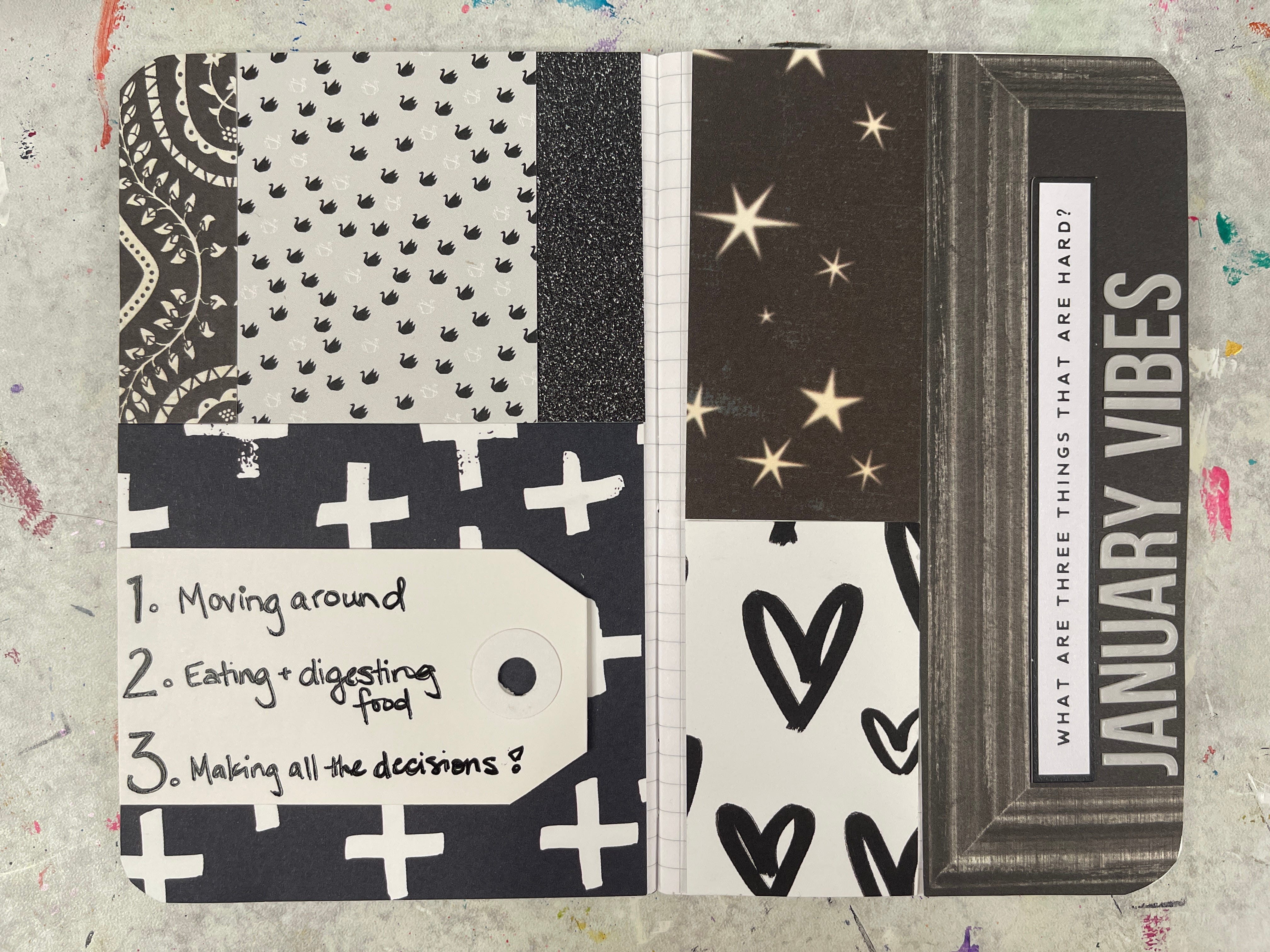 Today, I pulled out a quick recipe for a scrap collage. I grabbed a box of smaller patterned paper scraps and picked out all the scraps in black and white. I think it’s always easiest to pick a color family when my brain isn’t working—it relies more on my eyes than it does my brain and that’s perfect. My eyes and my hands are still working perfectly.