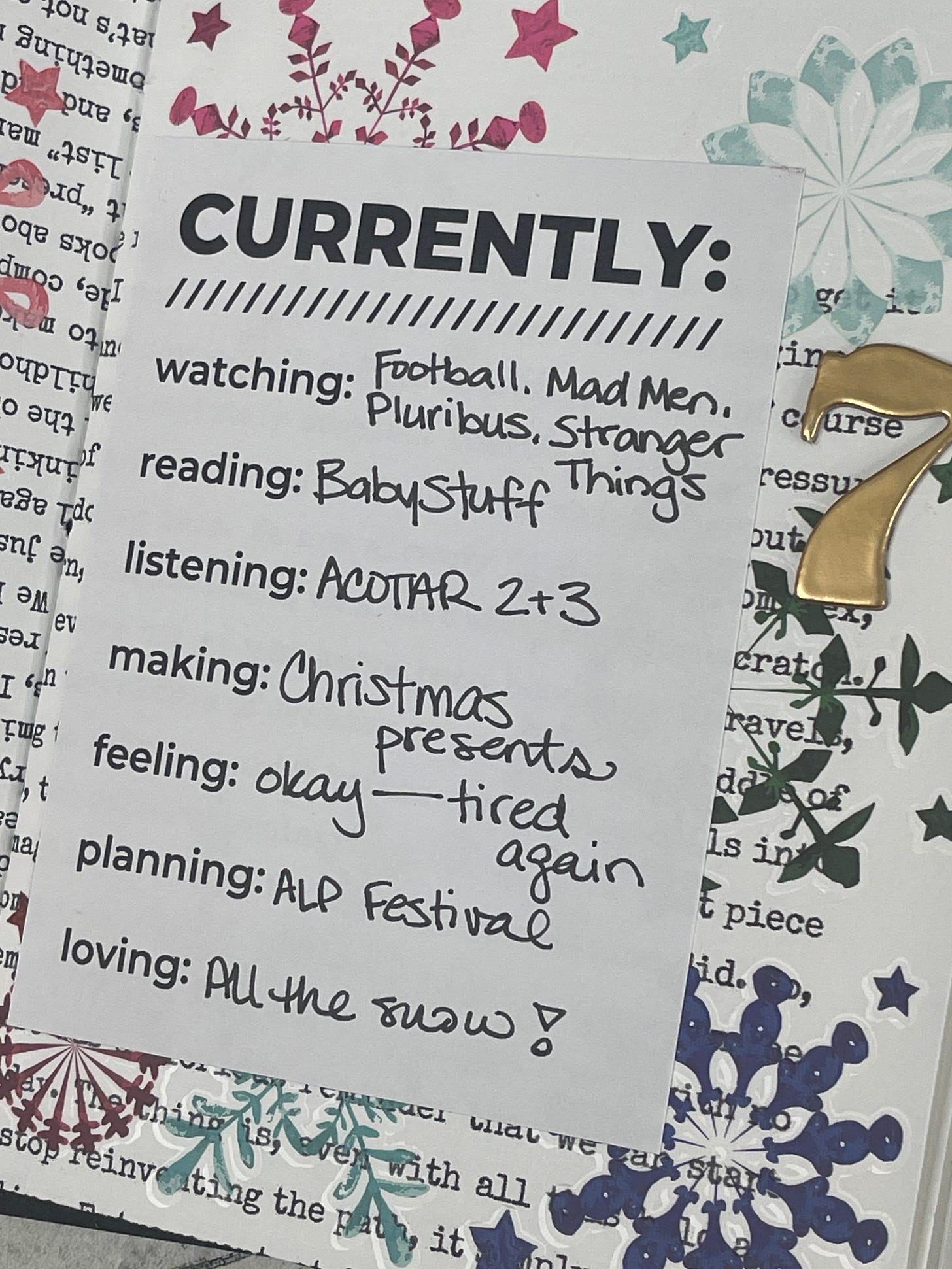For today’s page, I wanted to do a Currently List (my traditional Monday morning page). But it took me a few moments to figure out if I was going to put it on yesterday’s page in the book (Day 7) or today’s day in the book (Day 8). It’s more important to me that I get a story for each day, not that I perfectly keep every story “exactly where it’s supposed to go”. So I thought about my Sunday, and realized that I didn’t have any great stories that I wanted to tell, so the Currently List would be a perfect page for the day.