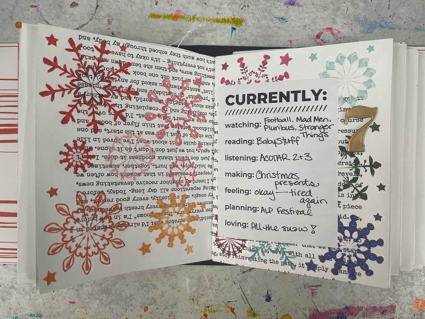 I thought they would look really cool against the text background of the Brandi pages, especially with all the different colors. I also wanted to make sure I was really showing them off—I didn’t want to be covering them up with a bunch of photos or journaling. So using them on this Currently List page was absolutely perfect. I love how they look.