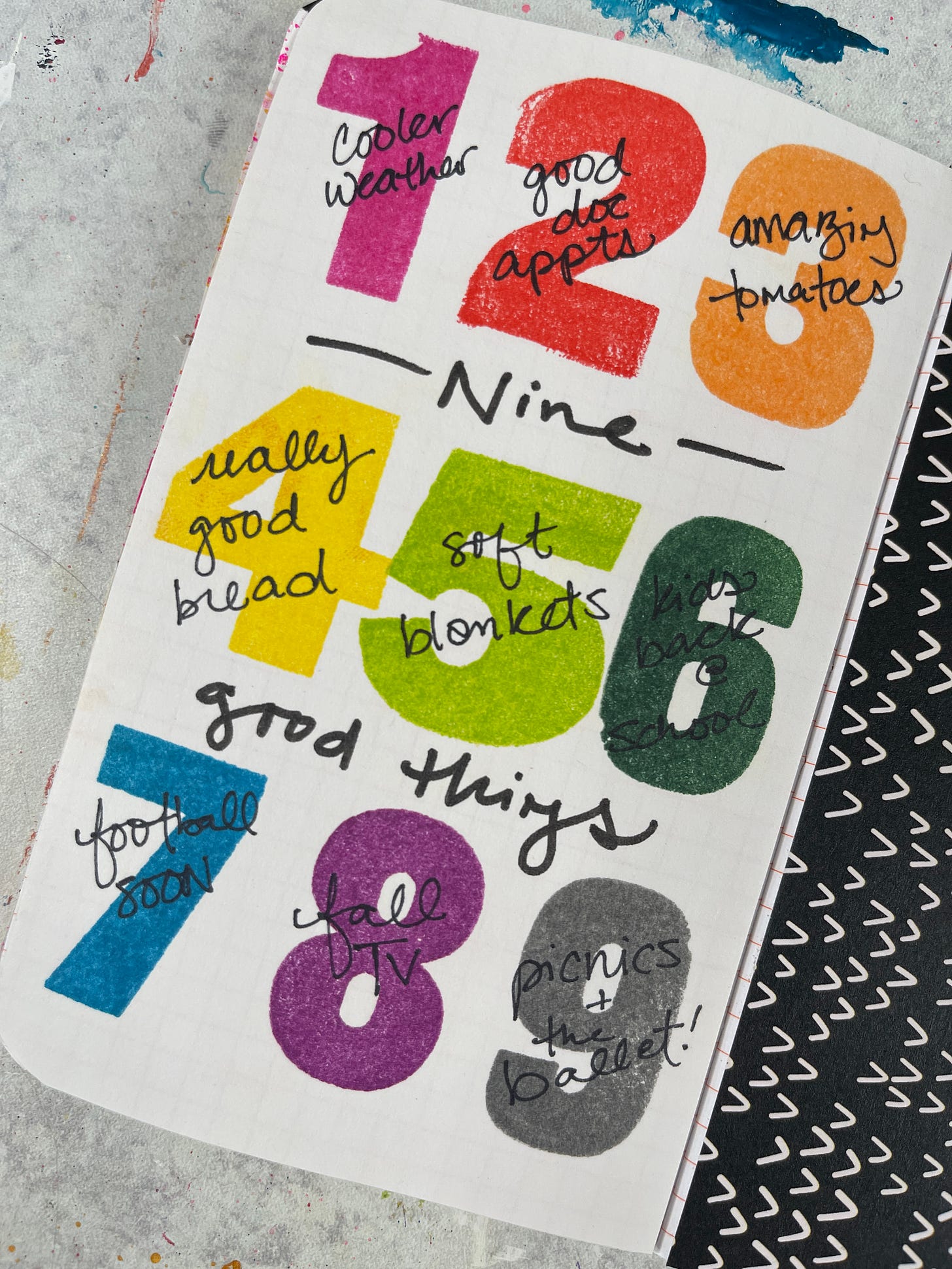 Today I grabbed a numbered stamp set from my friend Ali, and stamped 1-9 in rainbow order. I journaled “Nine Good Things” as my title, and then used a smaller nibbed pen to write out nine good things!