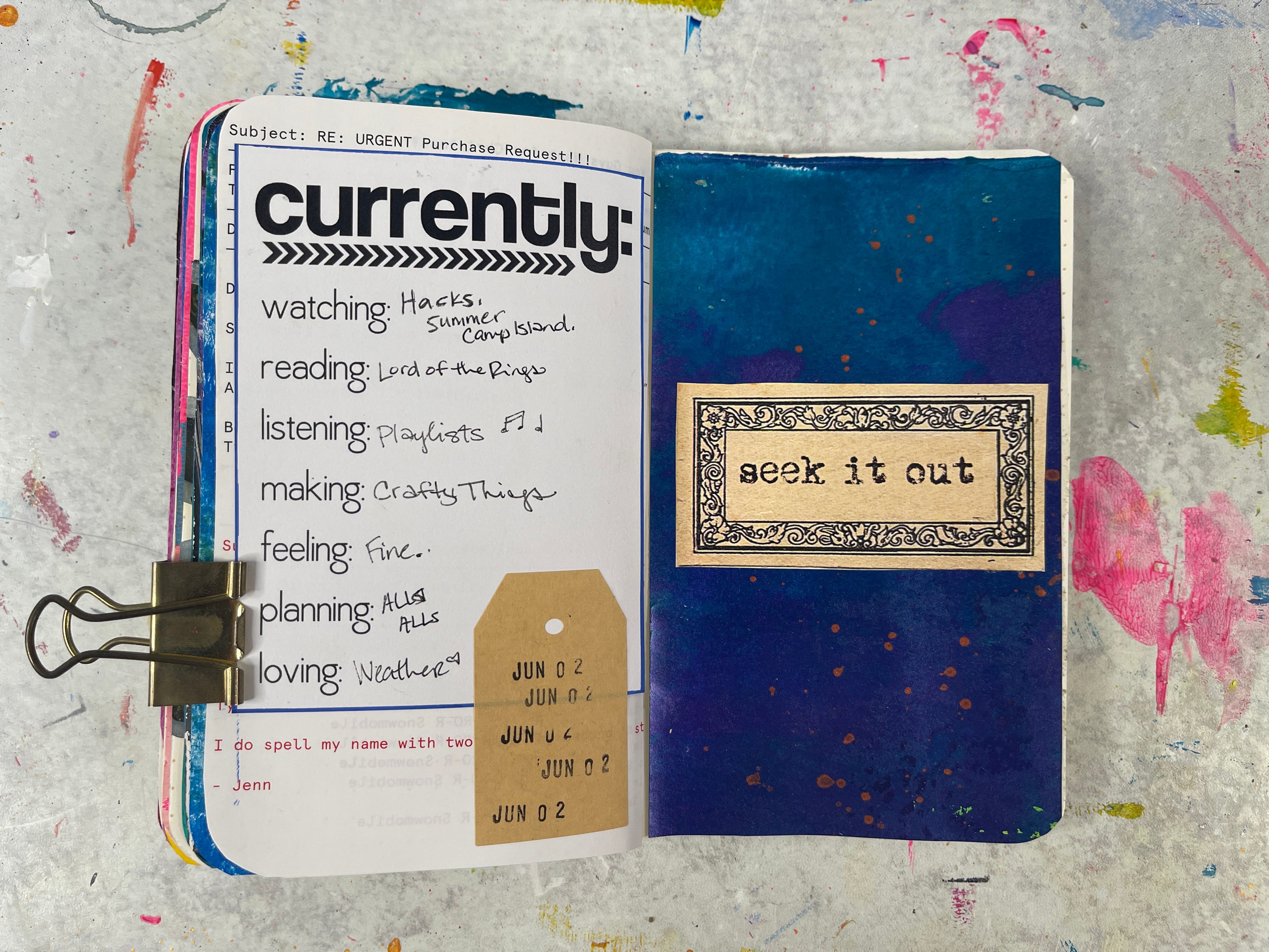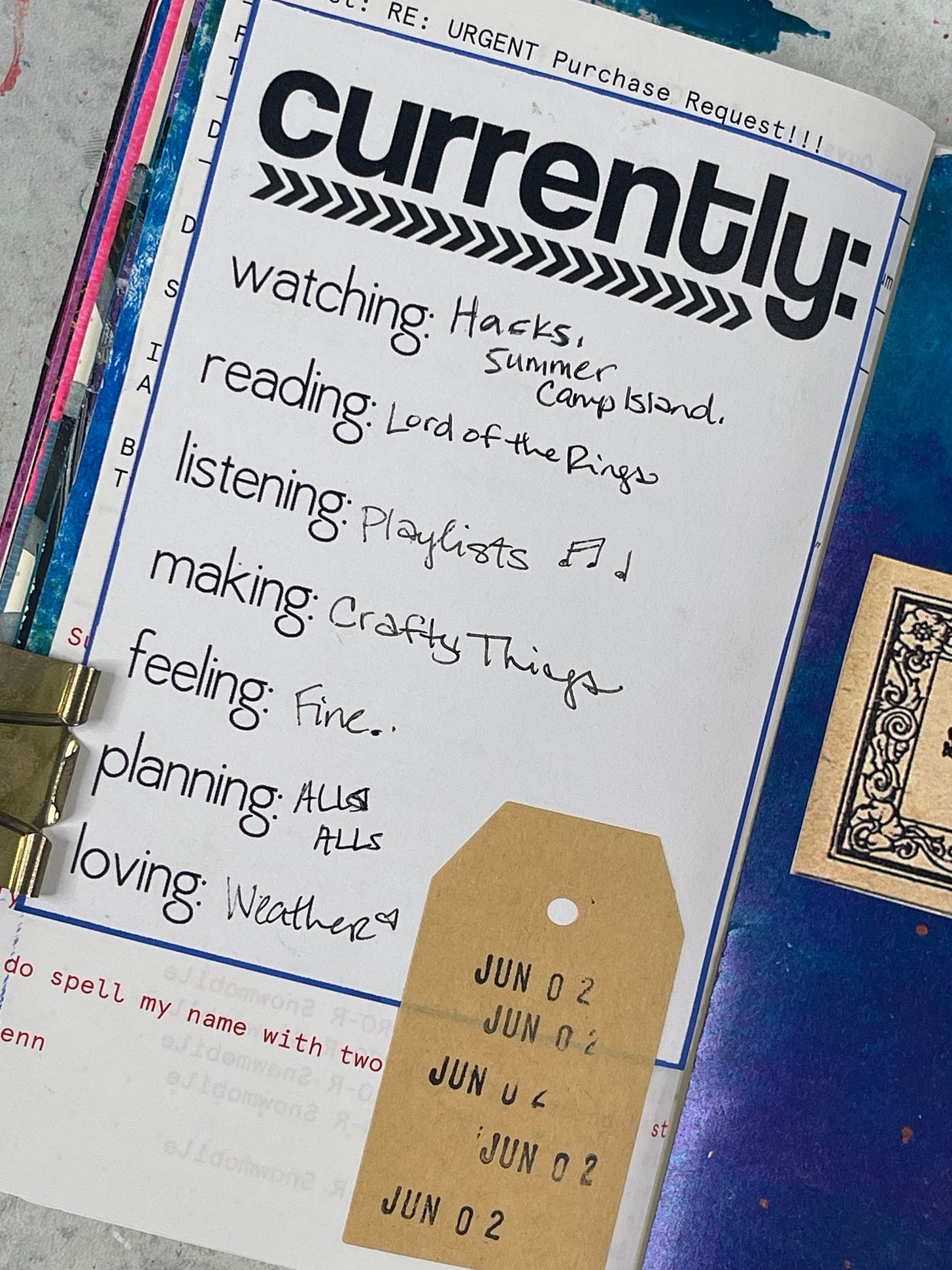 For today’s page, I used up one of my favorite gel print scraps and matched it with a bunch of printed text from a Cards Against Humanities thing years ago. I love how this one came together. So weird.