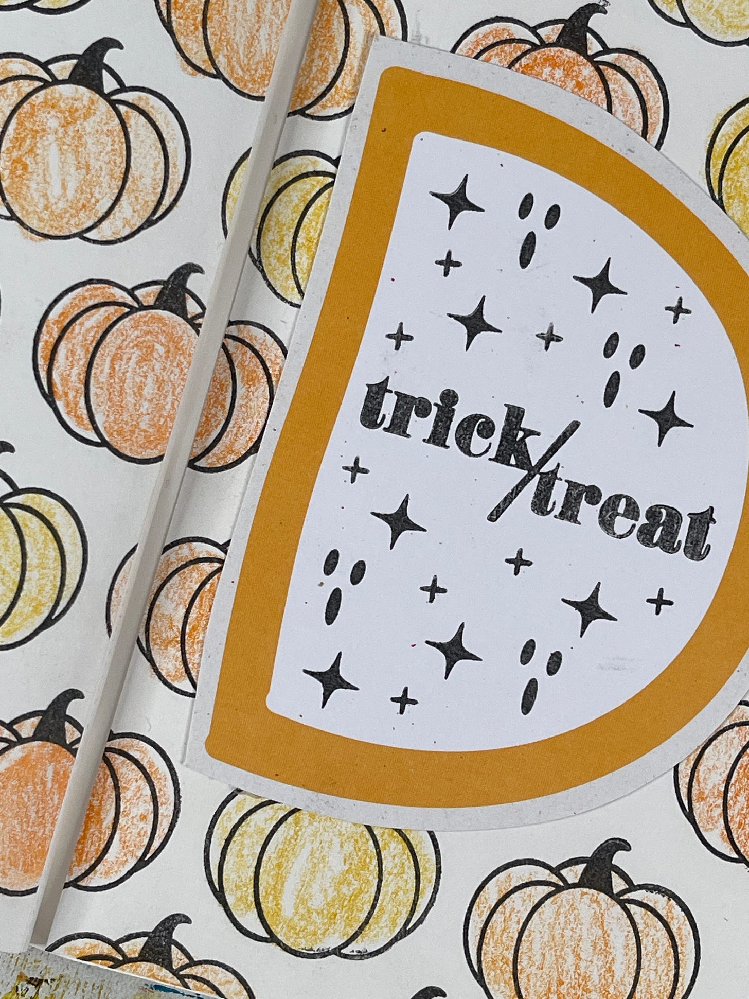 To finish up the page, I added a little trick or treat stamp and some little mark making stamps. A fun and simple title for my repeating background page.