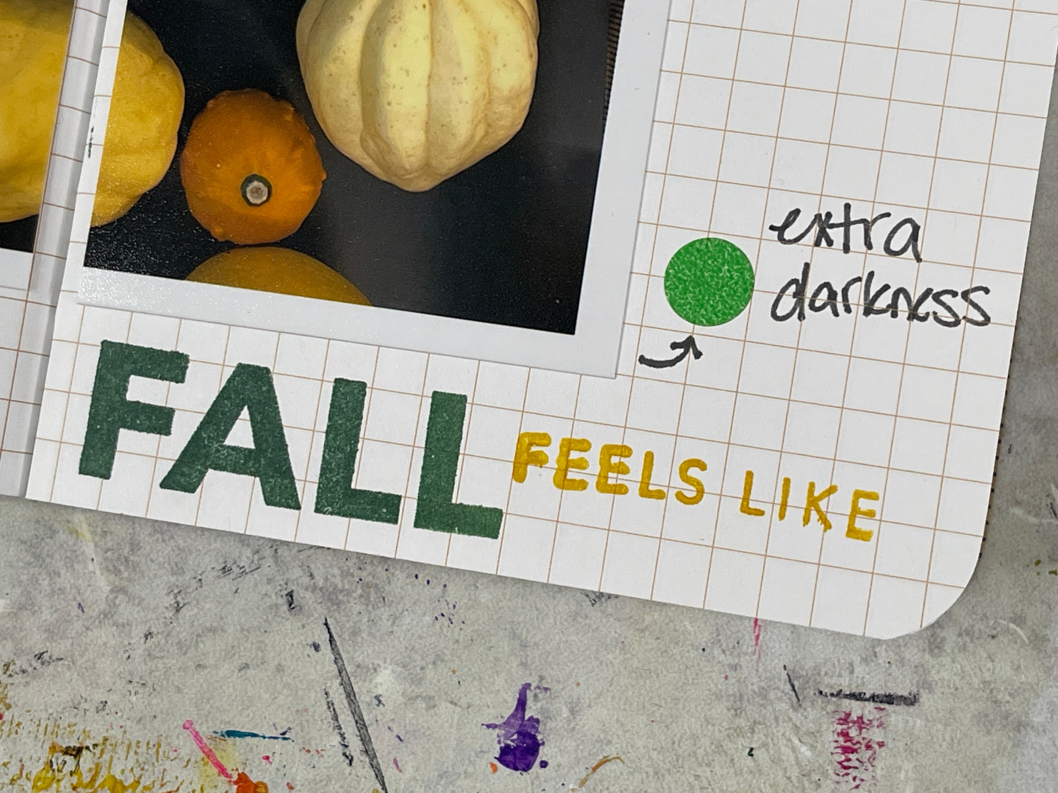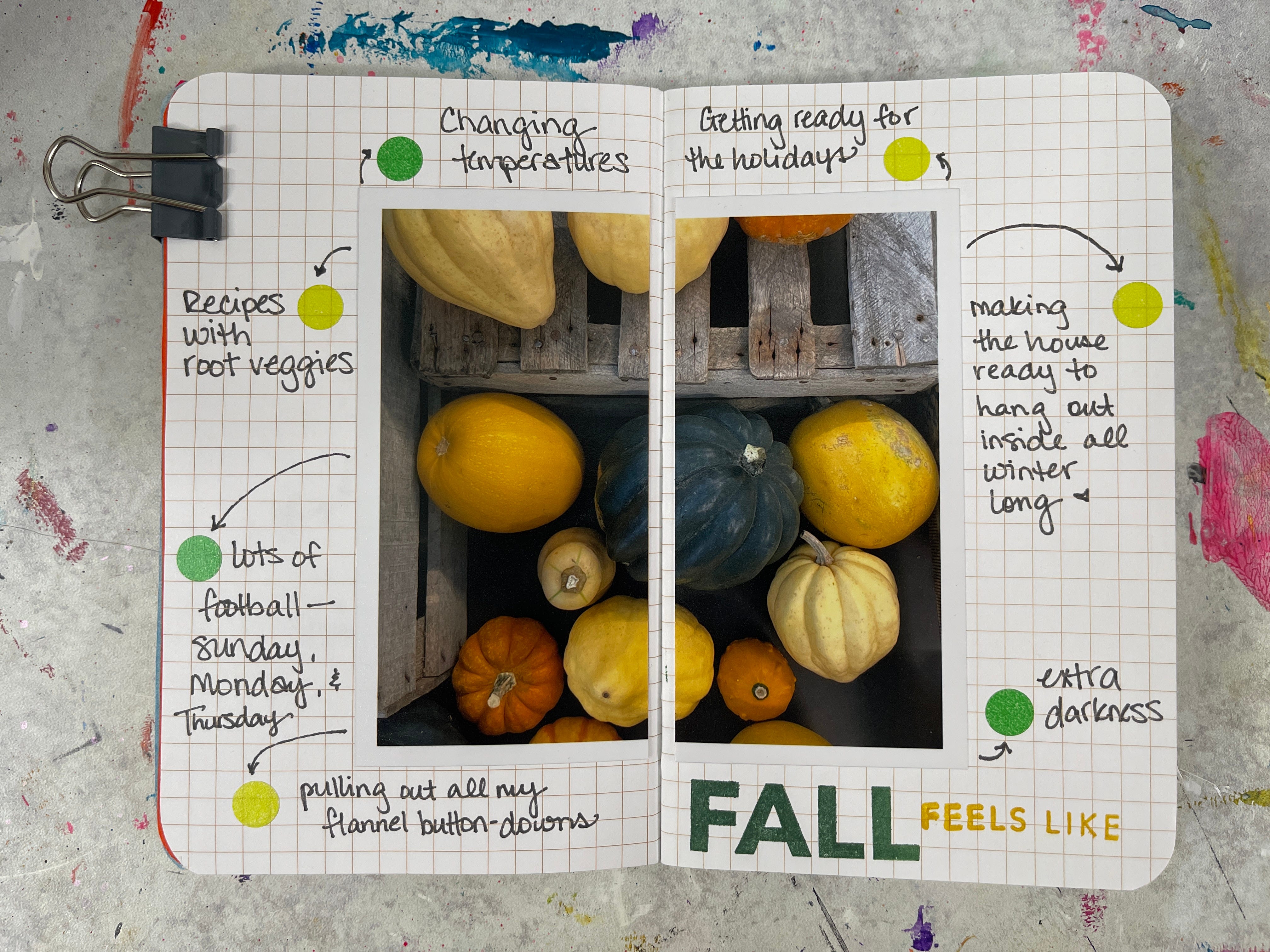 I grabbed a fall-inspired stamp set and stamped out my title “Fall feels like” and used that as the beginning prompt for all my journaling. I started in the upper left corner and wrote out a bunch of different things that make me think of all the fall feelings.
