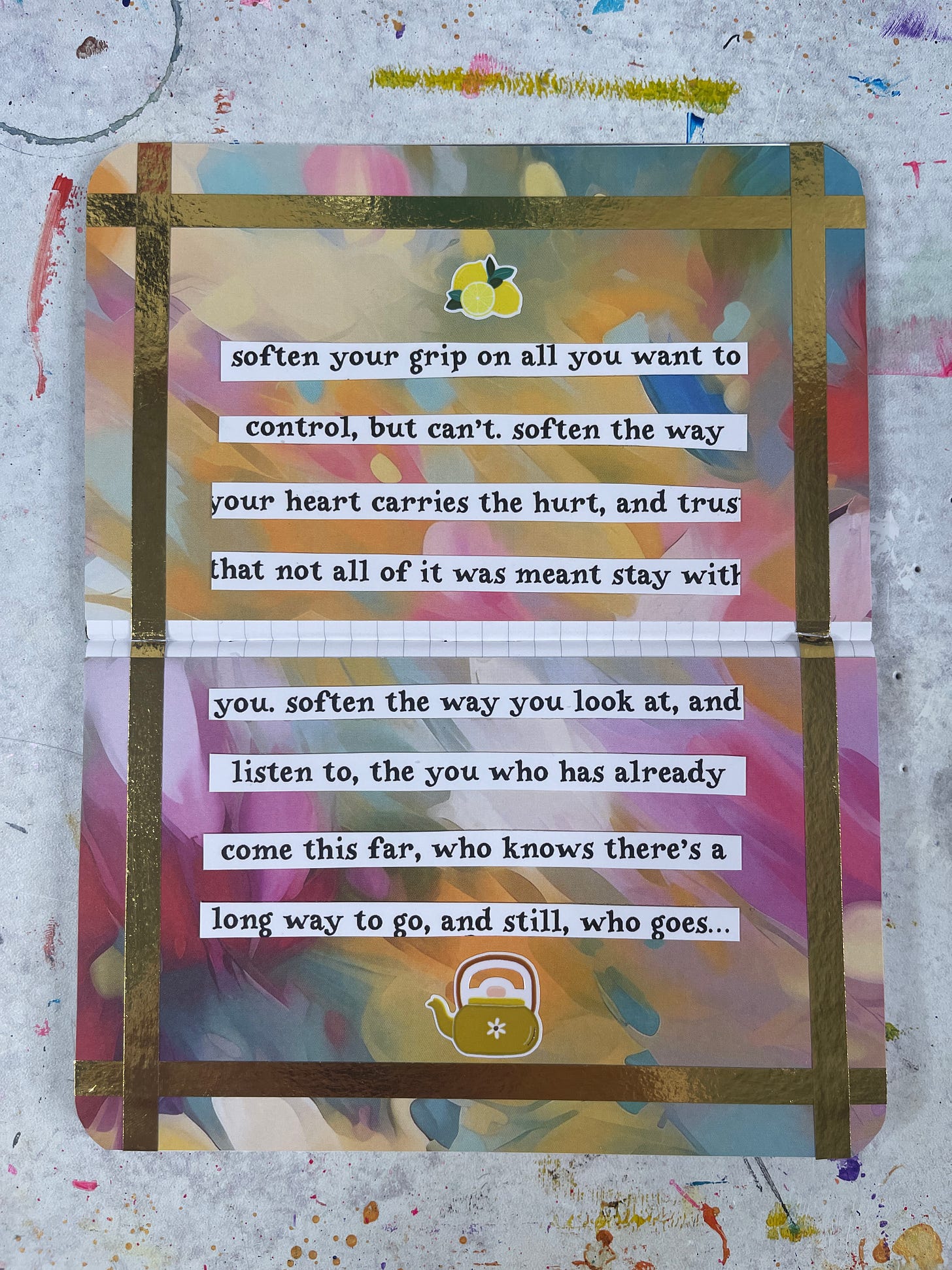 I picked out this quote from a recent envelope of Brandi Kincade cards, and after I snipped up the lines, I realized it was going to look better if I rotated the notebook 90 degrees instead of cutting up the quote lines across the two pages. It worked much better for today’s page, and it’s fun having to turn the notebook once in a while to catch everything.