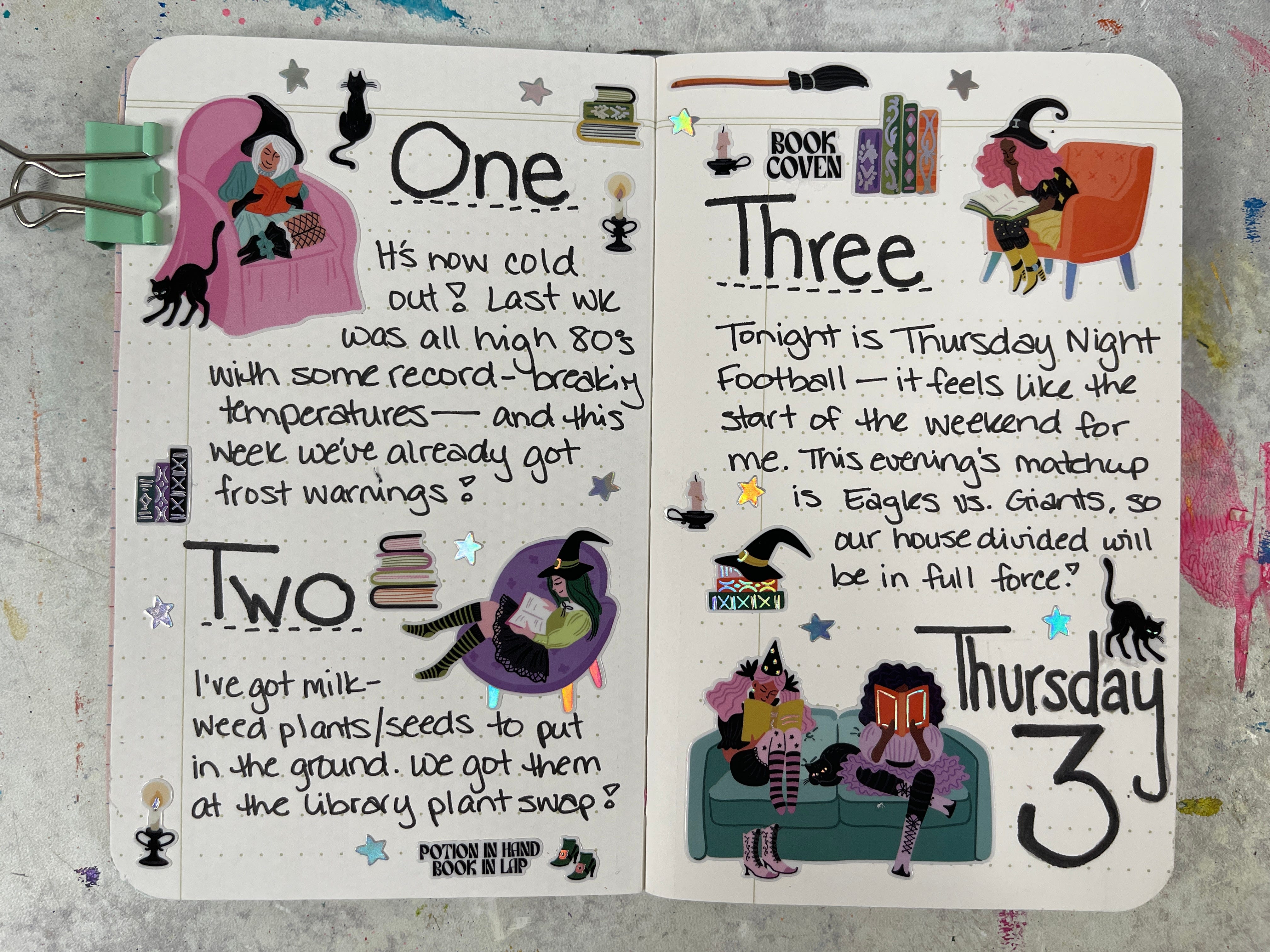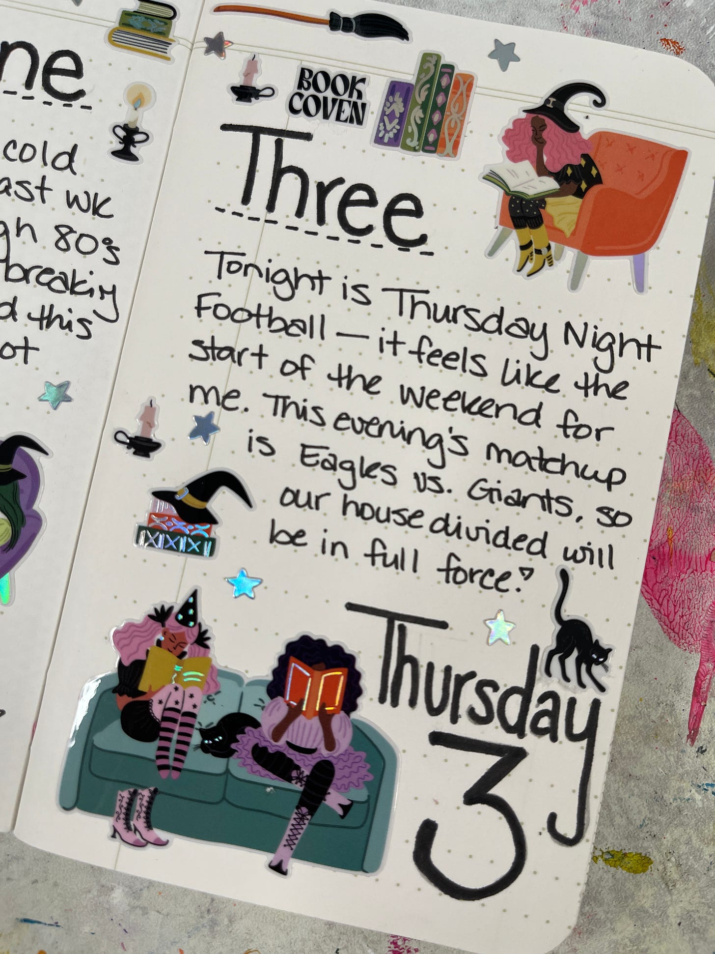 For today’s page, I started out knowing that I was going to create a Thursday3 page. And when I opened up my notebook, I was reminded of these fun journaling lines, that I don’t usually have in my books. So I decided to grab the spooky bag, and flip through the stickers. I was looking for a set that had at least three larger stickers that I could use to pair up with my numbers. I found this book witch set which is perfect.