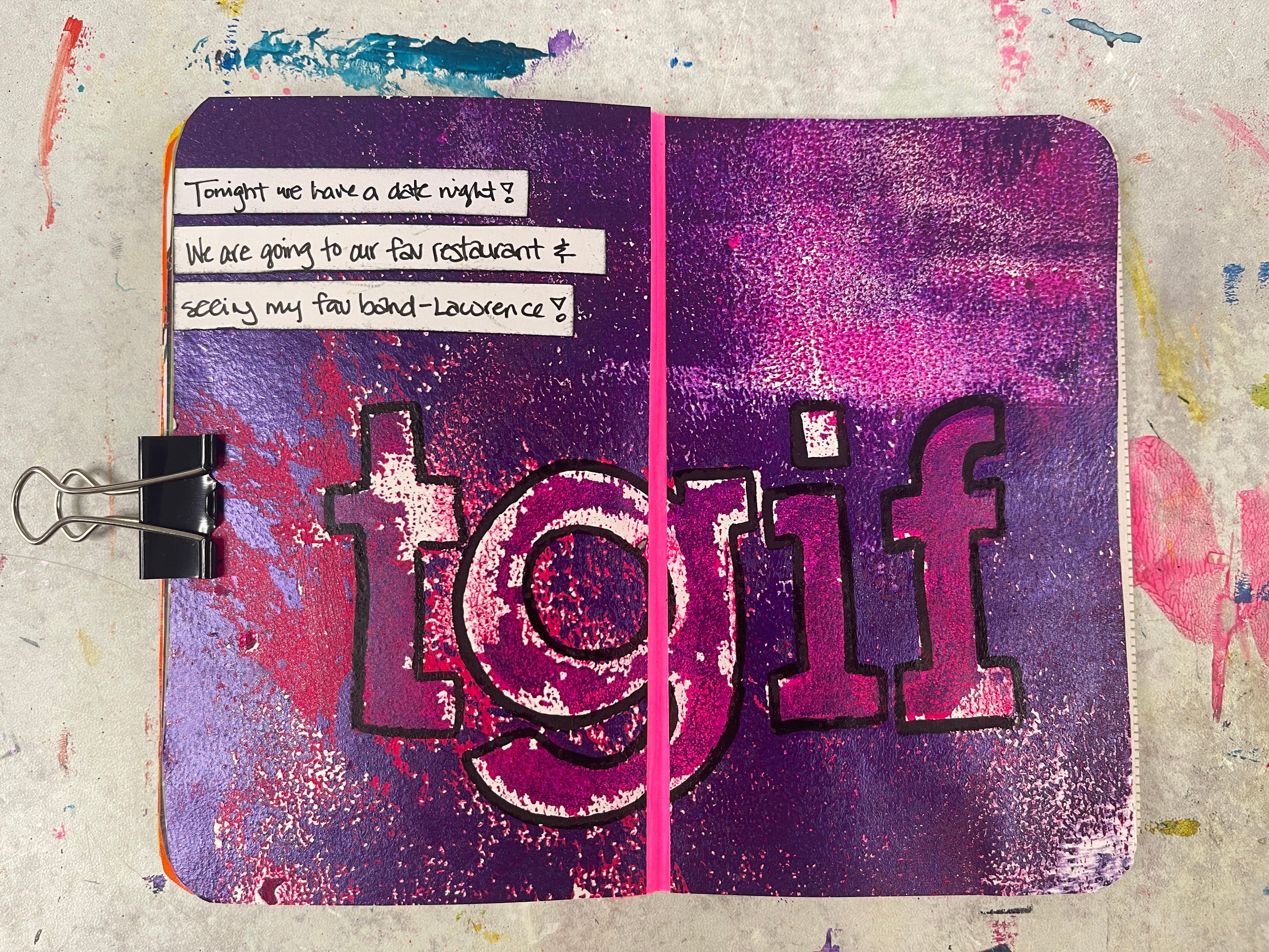 I started out with the layer of purple paint, and then used foam letter stamps to create the TGIF sentiment. I love foam stamps for this because it’s so easy to use them backwards (which you need to do in order to get a right side up word on the gel plate). It’s not something you can do as easily with clear or rubber stamps.