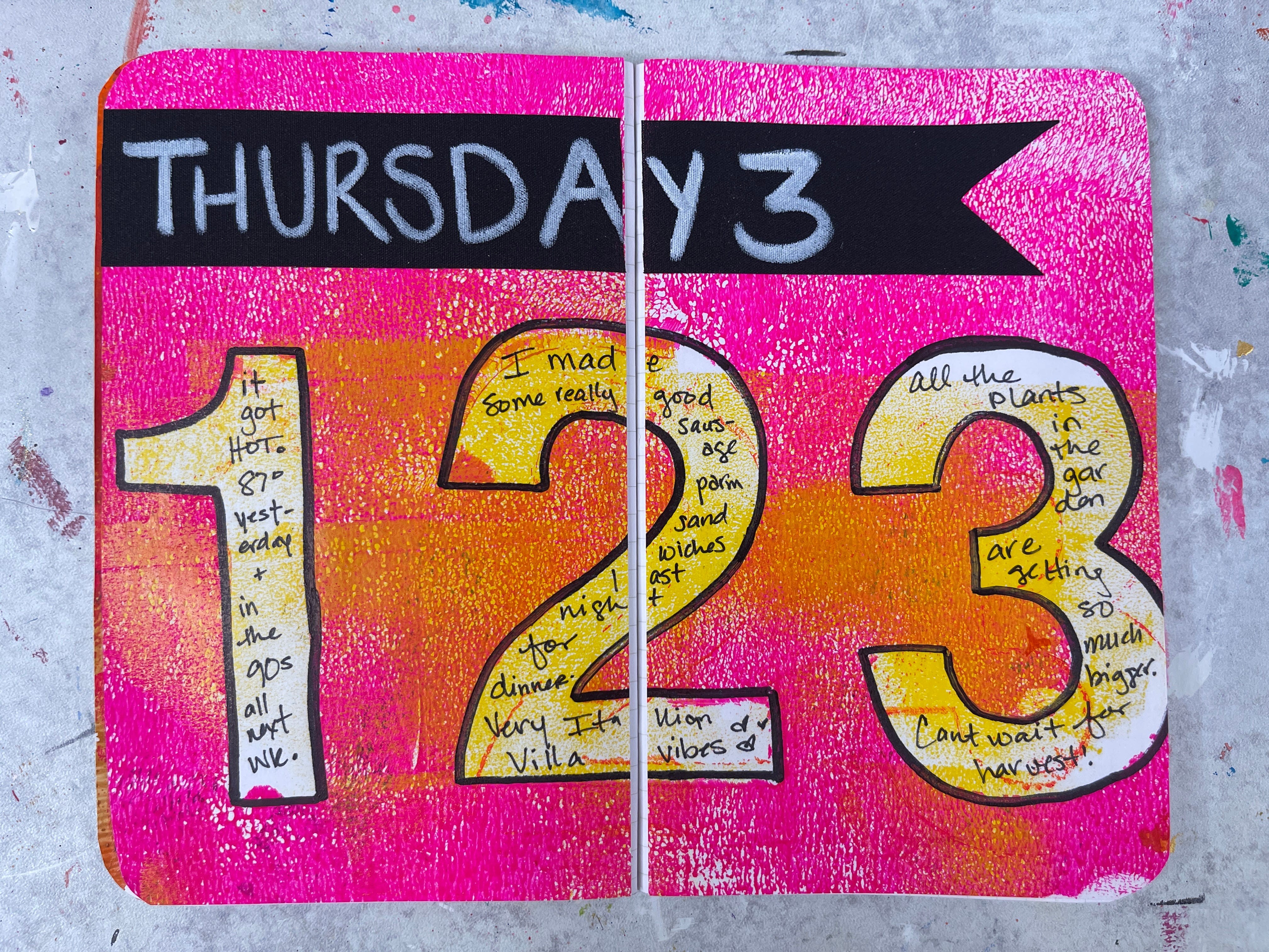 I pulled those same stickers I used earlier in the week, but this time I put them on the plate backwards (sticky side up) so that they’d show up correctly on the final print. I started out with a layer of that florescent magenta, and then followed up with a little bit of yellow on top, and I really like how that came out.