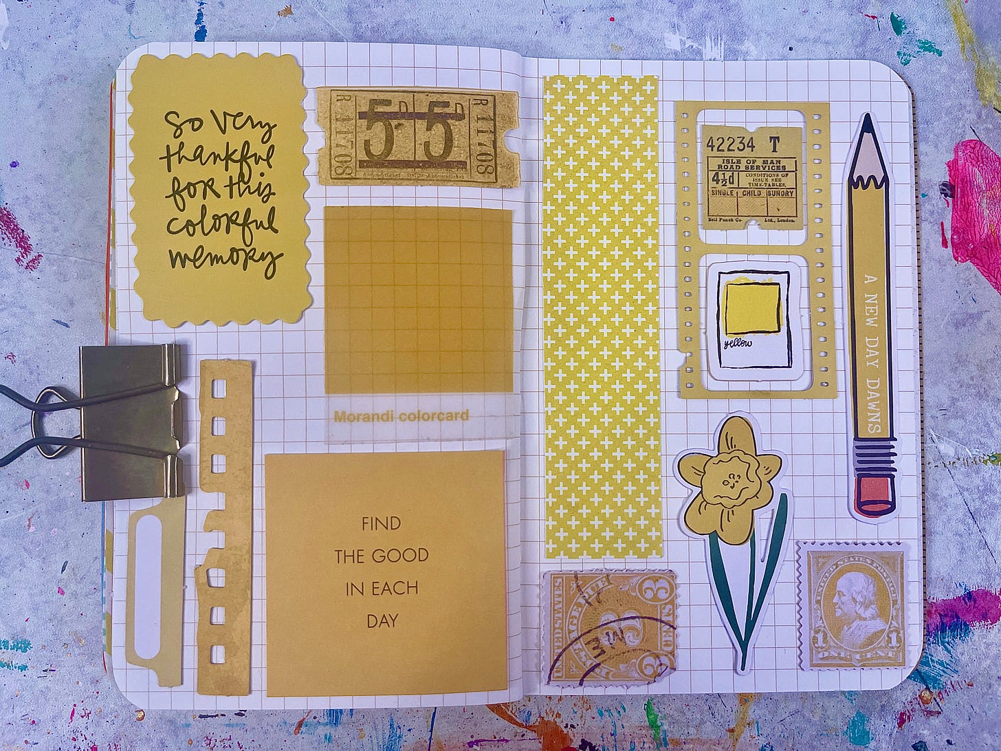 I keep all my little bits and bobs in clear containers on my desk—sorted by color. For today’s page, I grabbed the box of yellow bits, dumped it out all over the desk and found a bunch of different little things that fit on the page. There’s something super soothing about moving the little bits around the page until you figure out how they’re all going to fit the way you want.