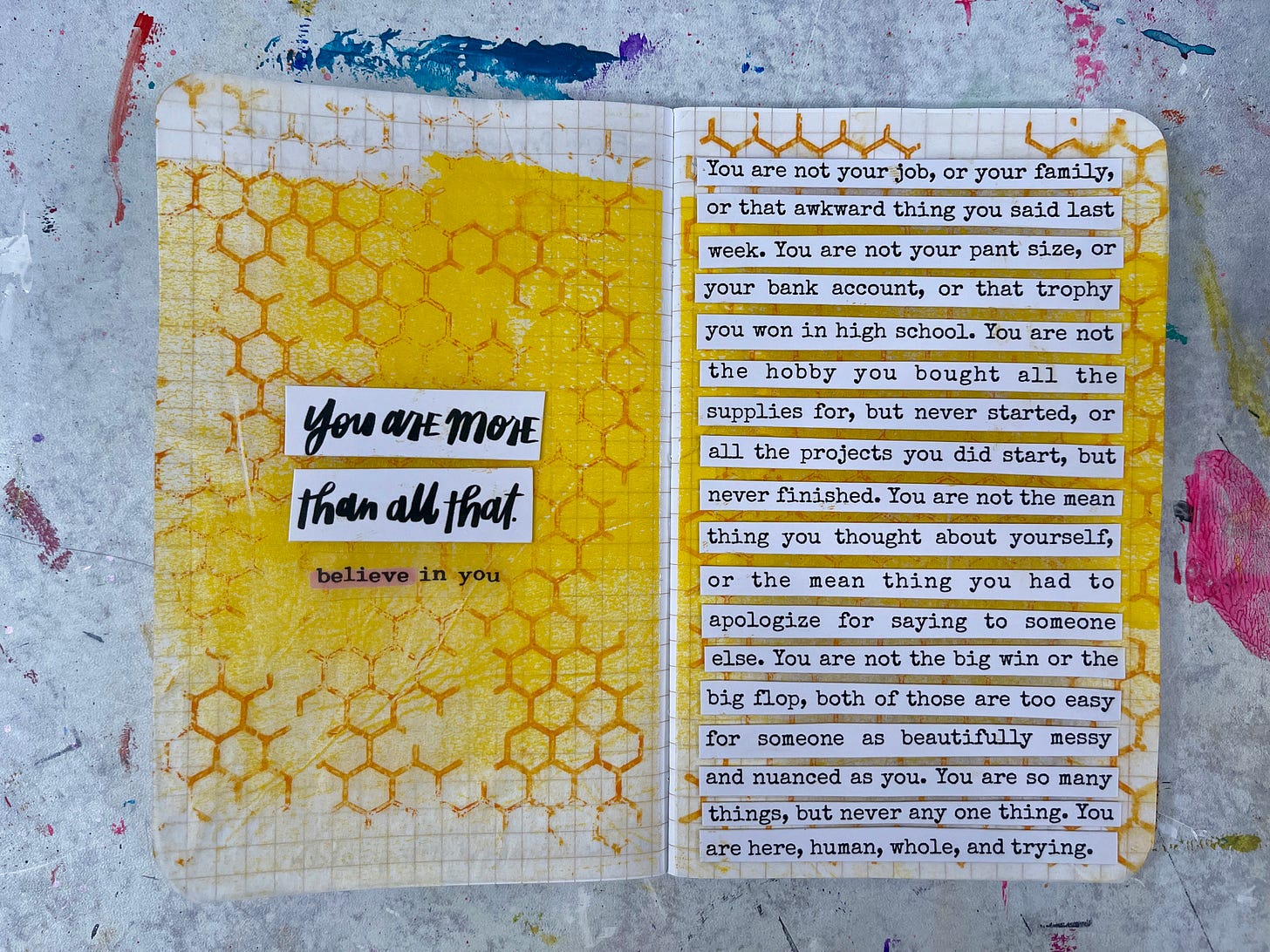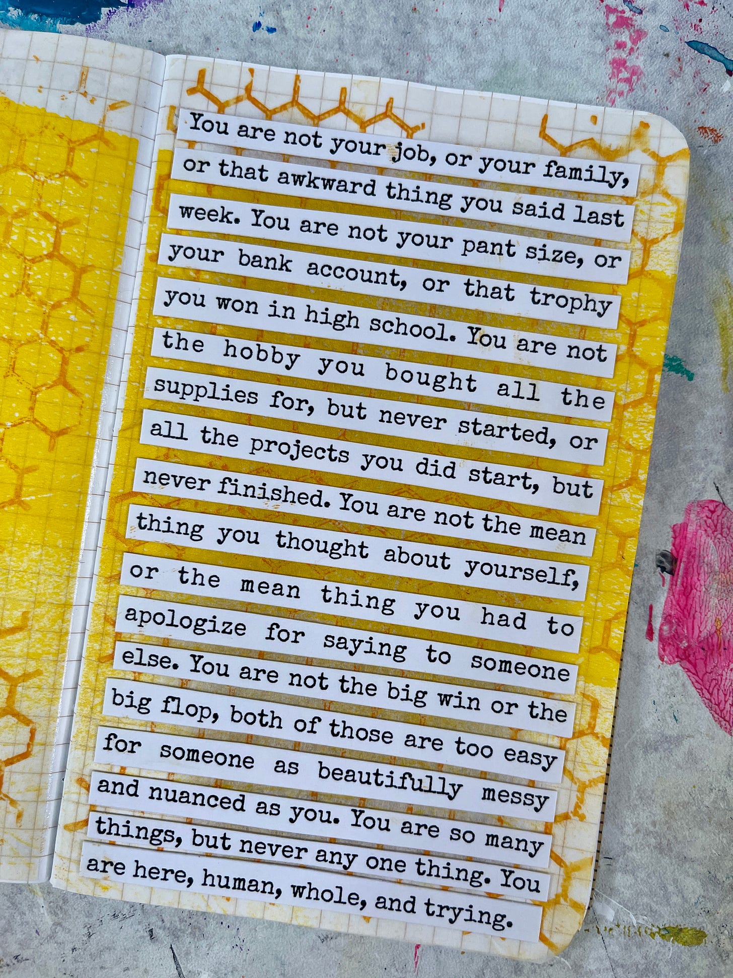 You are not your job, or your family, or that awkward thing you said last week. You are not your pant size or your bank account, or that trophy you won in high school. You are not the hobby you bought all the supplies for but never started, or all the projects you did start, but never finished. You are not the mean thing you thought about yourself, or the mean thing you had to apologize for saying to someone else. You are not the big win or the big flop, both of those are too easy for someone as beautifully messy and nuanced as you. You are so many things, but never any one thing. You are here, human, whole, and trying.