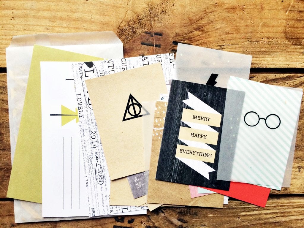 Journaling cards + paper bits. Most of the paper came from the Ali Edwards December Daily Kit, but I supplemented with my HP wizard journaling cards printed on kraft and vellum, and some random papers and journaling cards from my stash.