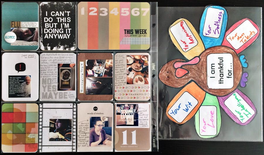 Obviously my favorite part of this spread is the arts and crafts turkey that J made for me at school. I had it hanging up in my studio until I put together this spread, now I can keep it forever.