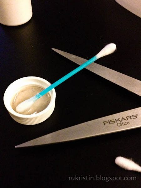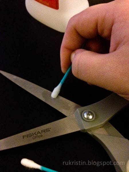 Step Three: Use the Q-tip to clean the blades of your scissors. Press down as hard as necessary to get off all the sticky stuff. Repeat as much as needed. I usually go through two Q-tips for each pair that I clean. Remember to clean the narrow sides of the blades too!