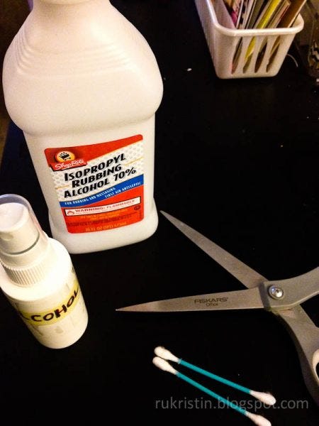 Step One: Grab your supplies (I have two bottles of rubbing alcohol--obviously you only need one)