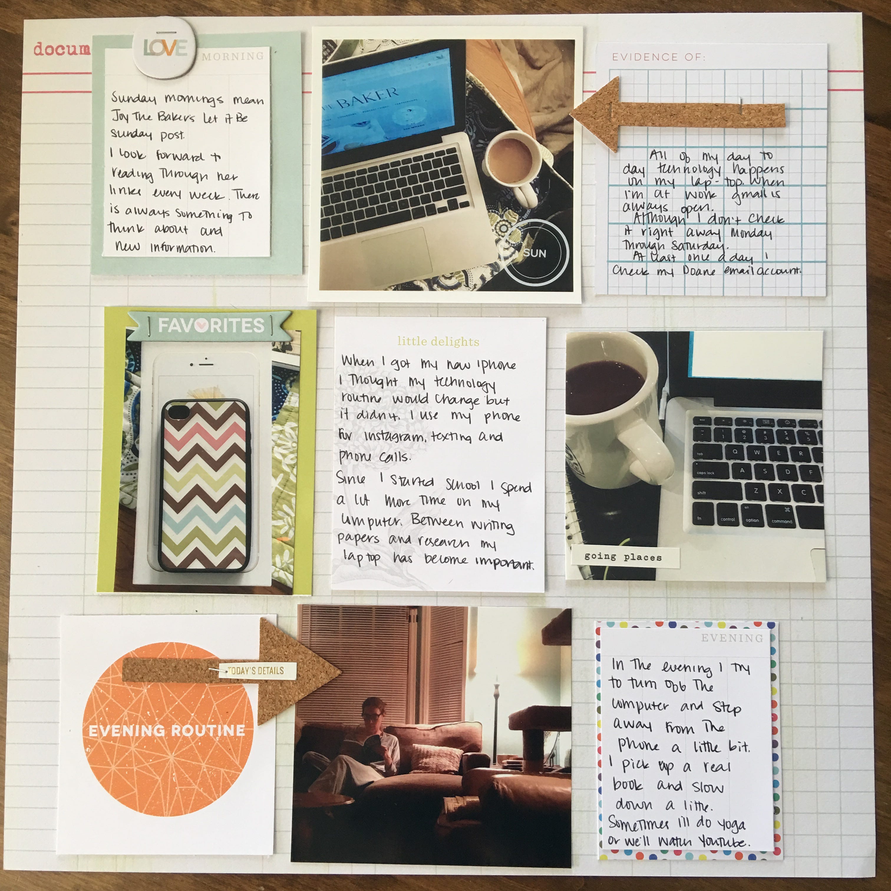There are many stories I wanted to tell around my technology routine. I used these stories as inspiration to create more journaling space on my traditional layout. It was important for me to include not only my day to day use of technology but also my deliberate attempt to unplug at night and unwind.