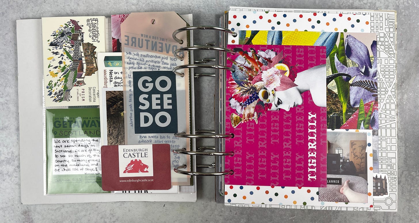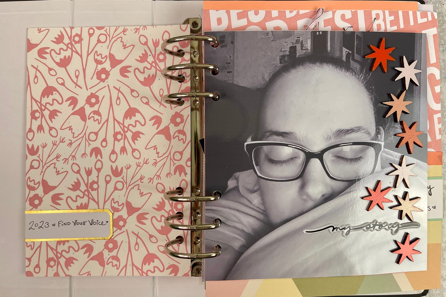 Sometimes that looks like a list. Sometimes it’s a photo collage or a messy page full of random visual stuff like papers or embellishments. But when I flip back through those notebooks, I can see the patterns of my life take shape. The ingredients are always there: pictures, words, creative supplies, and little bits of life.